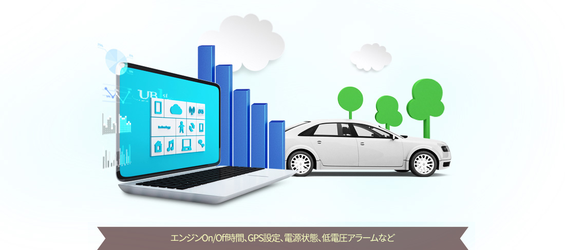 エンジンOn/Off時間、GPS設定、電源状態、低電圧アラームなど