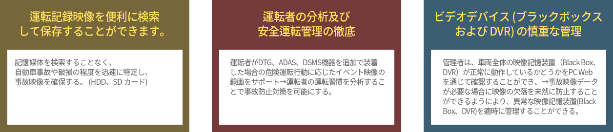 ドライブレコーダーとDVRにより、事故映像、常時録画映像、現在車両の前/後方状態を遠隔で確認車両管制アップグレード! 映像管制サービス