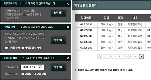 - 차량 상태 요청, 재시동 금지, 보고주기 설정, 저전압 설정, GPS 설정 기능