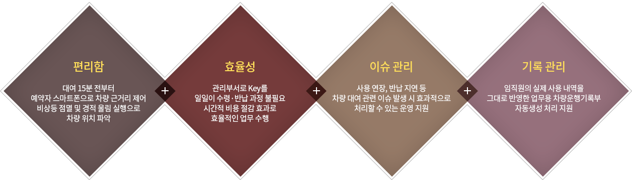 비즈플릿은 유모스원만의 경험과 노하우를 바탕으로 효율적인 업무용 차량관리와 공유에 필요한 핵심 기능을 통합한 서비스입니다.