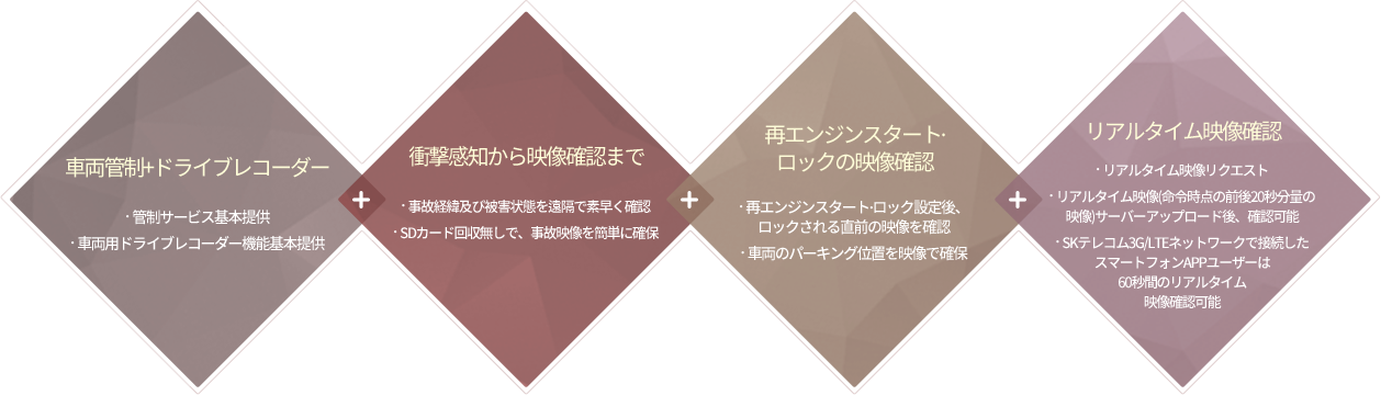 ドライブレコーダーとDVRにより、事故映像、常時録画映像、現在車両の前/後方状態を遠隔で確認車両管制アップグレード! 映像管制サービス